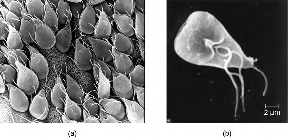 The third and final supergroup to be considered in this section is the Excavata, which includes primitive eukaryotes and many parasites with limited metabolic abilities. These organisms have complex cell shapes and structures, often including a depression on the surface of the cell called an excavate. The group Excavata includes the subgroups Fornicata, Parabasalia, and Euglenozoa. The Fornicata lack mitochondria but have flagella. This group includes Giardia lamblia (also known as G. intestinalis or G. duodenalis), a widespread pathogen that causes diarrheal illness and can be spread through cysts from feces that contaminate water supplies (Figure 5.3). Parabasalia are frequent animal endosymbionts; they live in the guts of animals like termites and cockroaches. They have basal bodies and modified mitochondria (kinetoplastids). They also have a large, complex cell structure with an undulating membrane and often have many flagella. The trichomonads (a subgroup of the Parabasalia) include pathogens such as Trichomonas vaginalis, which causes the human sexually transmitted disease trichomoniasis. Trichomoniasis often does not cause symptoms in men, but men are able to transmit the infection. In women, it causes vaginal discomfort and discharge and may cause complications in pregnancy if left untreated.