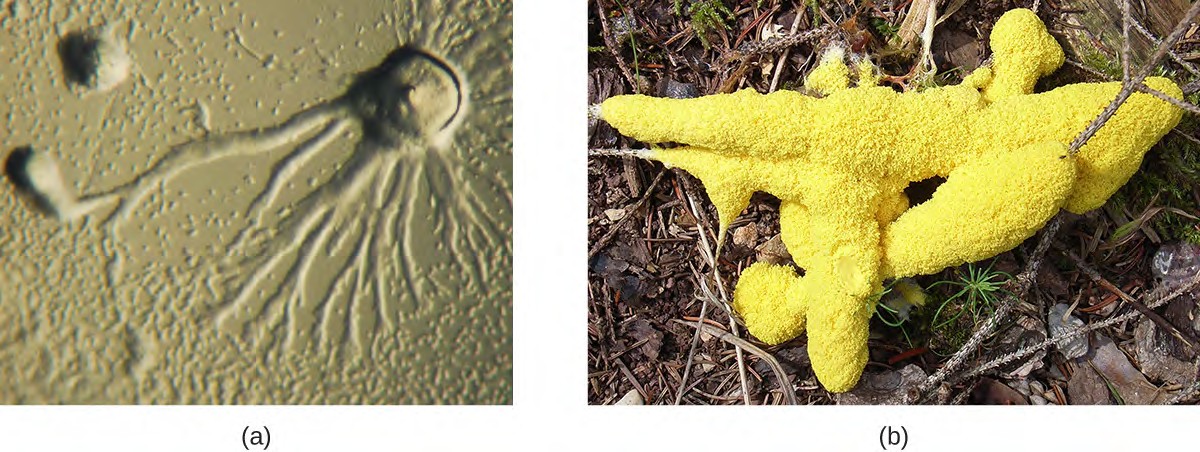 Figure 5.9 (a) The cellular slime mold Dictyostelium discoideum can be grown on agar in a Petri dish. In this image, individual amoeboid cells (visible as small spheres) are streaming together to form an aggregation that is beginning to rise in the upper right corner of the image. The primitively multicellular aggregation consists of individual cells that each have their own nucleus. (b) Fuligo septica is a plasmodial slime mold. This brightly colored organism consists of a large cell with many nuclei.