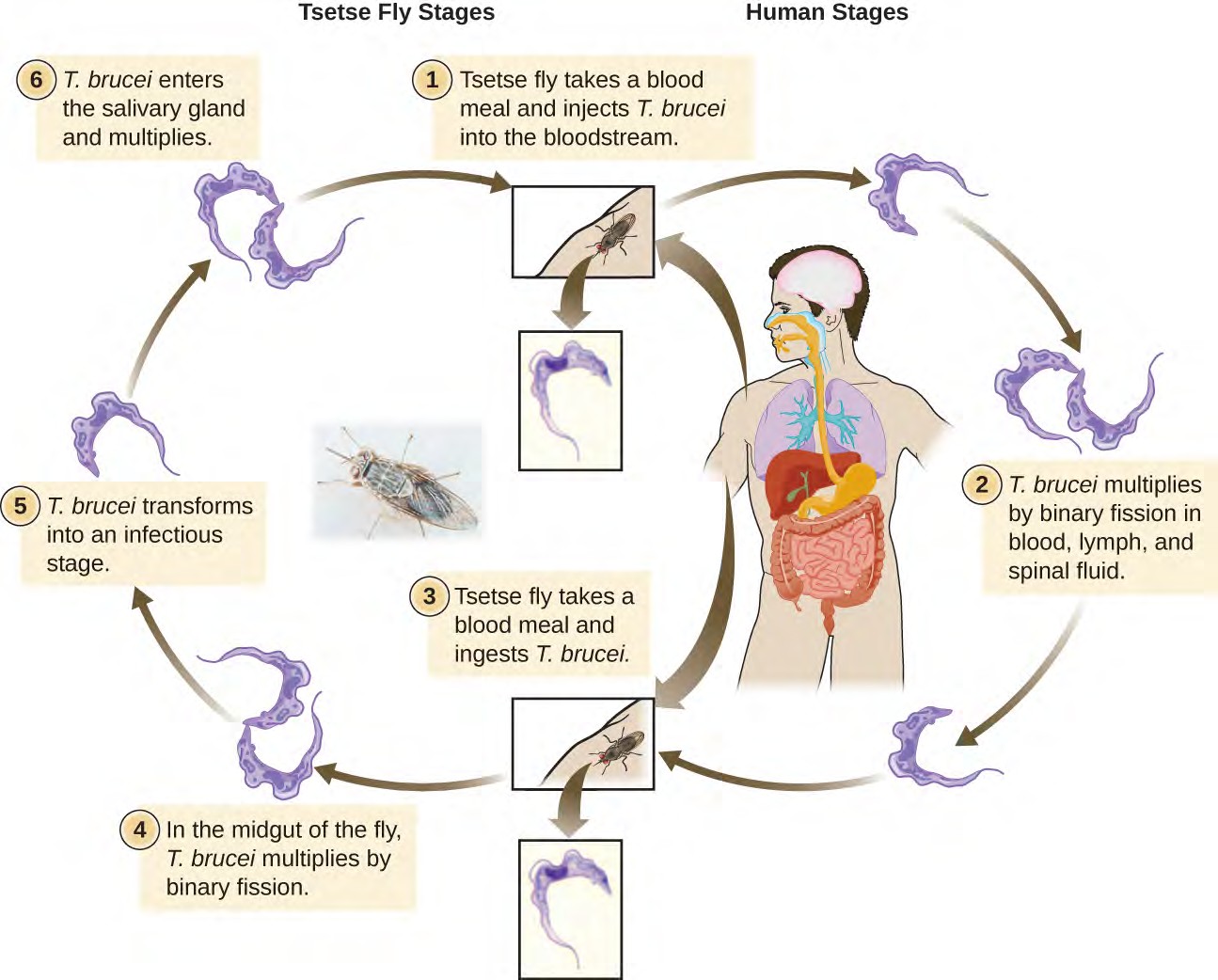 Figure 5.18 Trypanosoma brucei, the causative agent of African trypanosomiasis, spends part of its life cycle in the tsetse fly and part in humans. (credit “illustration”: modification of work by Centers for Disease Control and Prevention; credit “photo”: DPDx/Centers for Disease Control and Prevention)