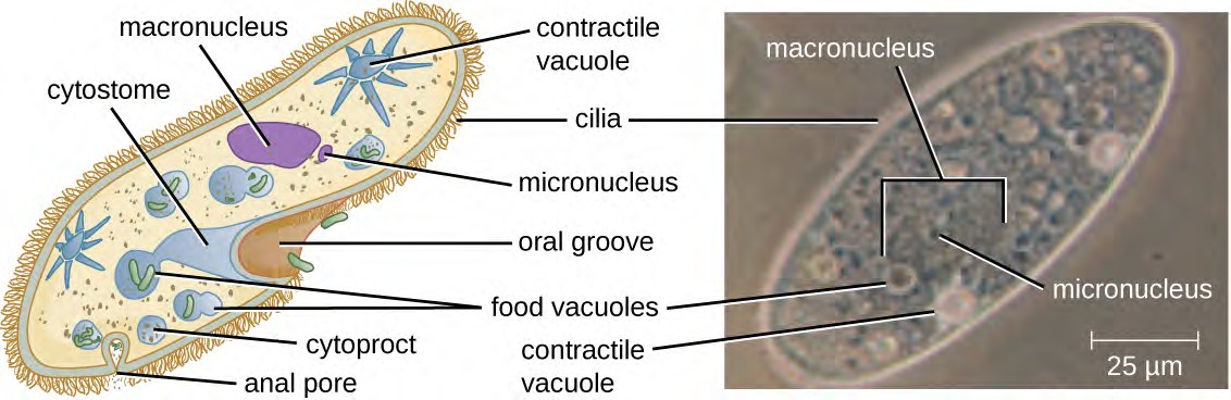 (b) The pellicle, under the cell membrane, gives the cell its distinctive shape and is visible in this image as delicate parallel striations over the surface of the entire cell (especially visible over the grey contractile vacuole). (credit a: modification of work by Claudio Miklos; credit b: modification of work by David Shykind)