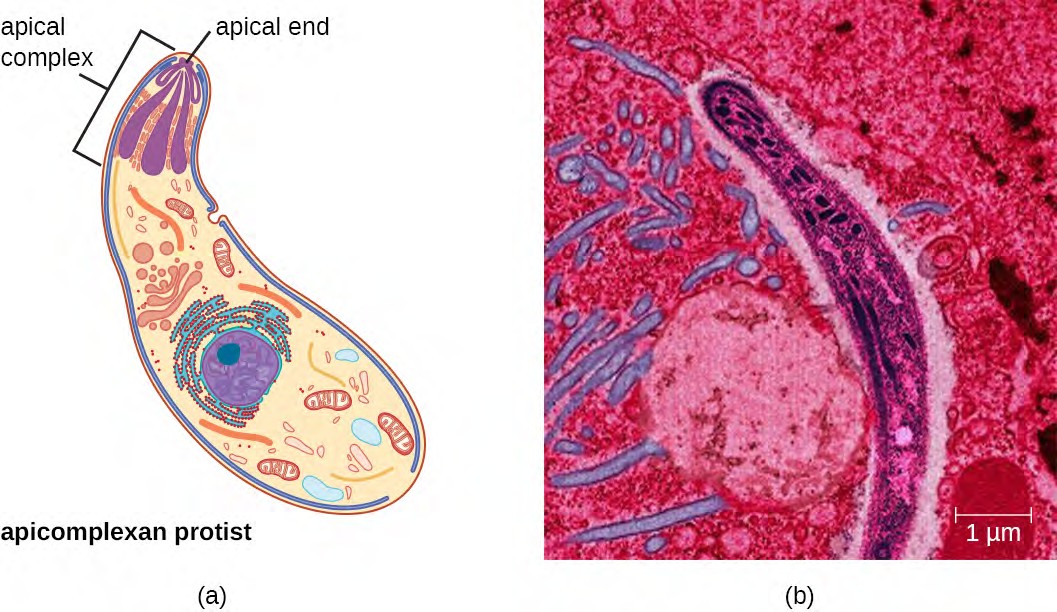 Figure 5.12 (a) Apicomplexans are parasitic protists. They have a characteristic apical complex that enables them to infect host cells. (b) A colorized electron microscope image of a Plasmodium sporozoite. (credit b: modification of work by Ute Frevert)