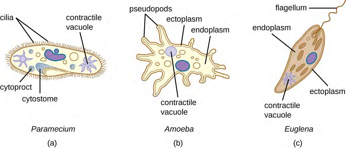 Protozoans have a variety of unique organelles and sometimes lack organelles found in other cells. Some have contractile vacuoles, organelles that can be used to move water out of the cell for osmotic regulation (salt and water balance) (Figure 5.5). Mitochondria may be absent in parasites or altered to kinetoplastids (modified mitochondria) or hydrogenosomes (see Unique Characteristics of Prokaryotic Cells for more discussion of these structures).