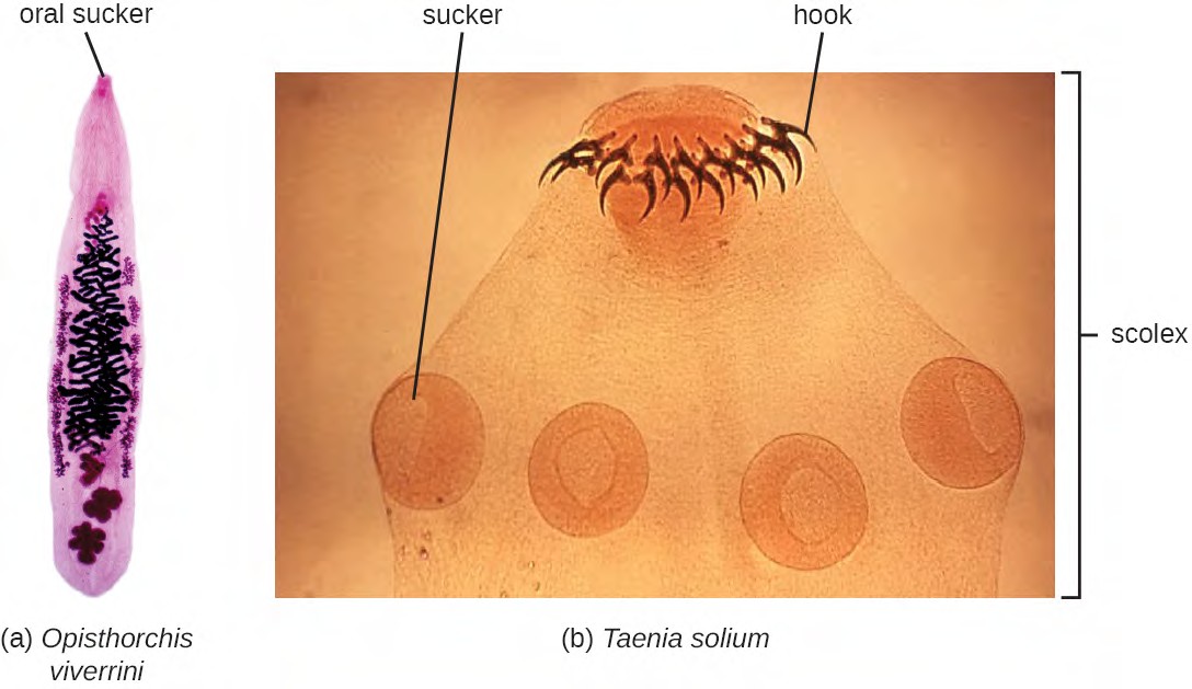 Phylum Platyhelminthes (the platyhelminths) are flatworms. This group includes the flukes, tapeworms, and the turbellarians, which include planarians. The flukes and tapeworms are medically important parasites ( Figure 5.20).