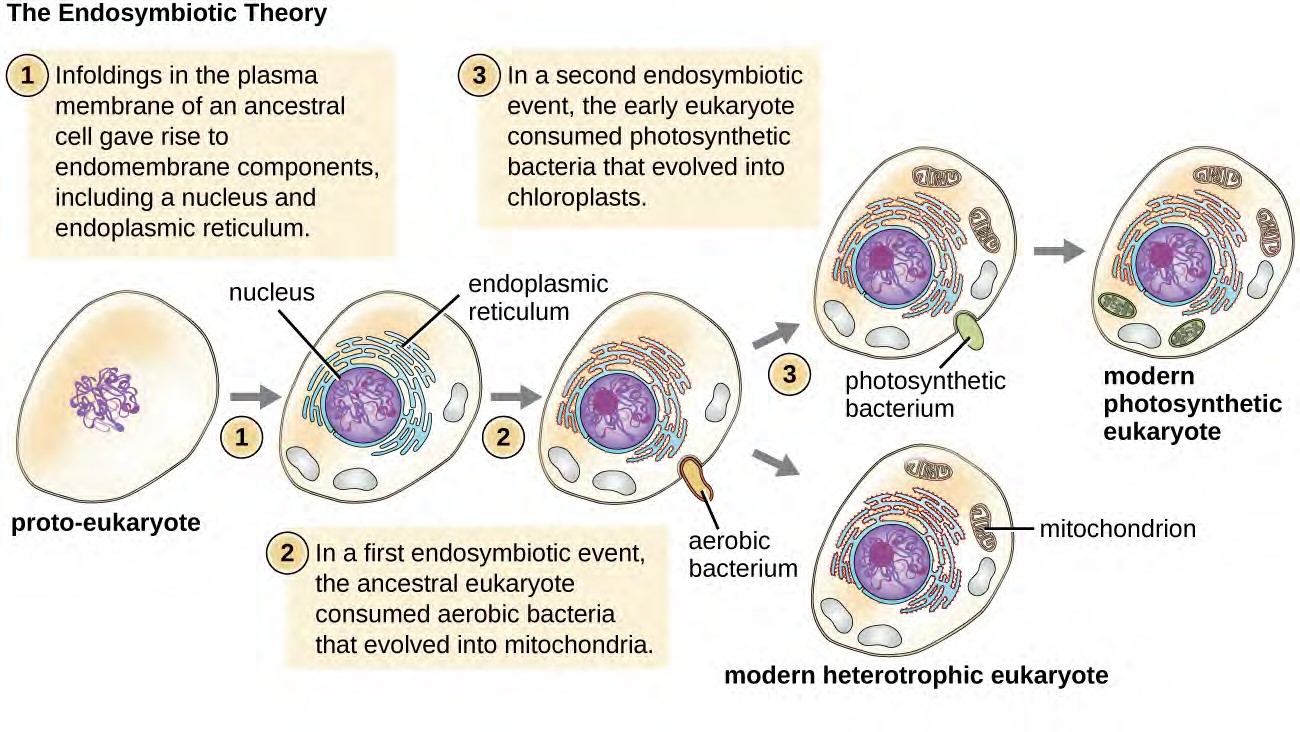 Figure 3.7 According to the endosymbiotic theory, mitochondria and chloroplasts are each derived from the uptake of bacteria. These bacteria established a symbiotic relationship with their host cell that eventually led to the bacteria evolving into mitochondria and chloroplasts.