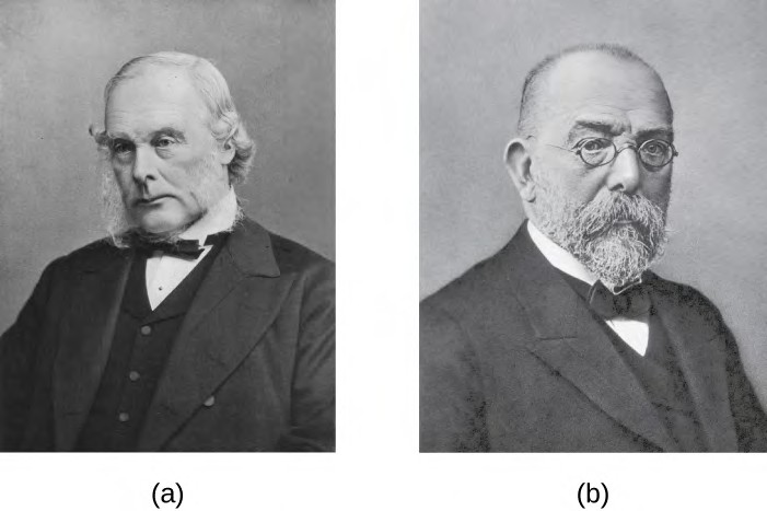 Figure 3.9 (a) Joseph Lister developed procedures for the proper care of surgical wounds and the sterilization of surgical equipment. (b) Robert Koch established a protocol to determine the cause of infectious disease. Both scientists contributed significantly to the acceptance of the germ theory of disease.