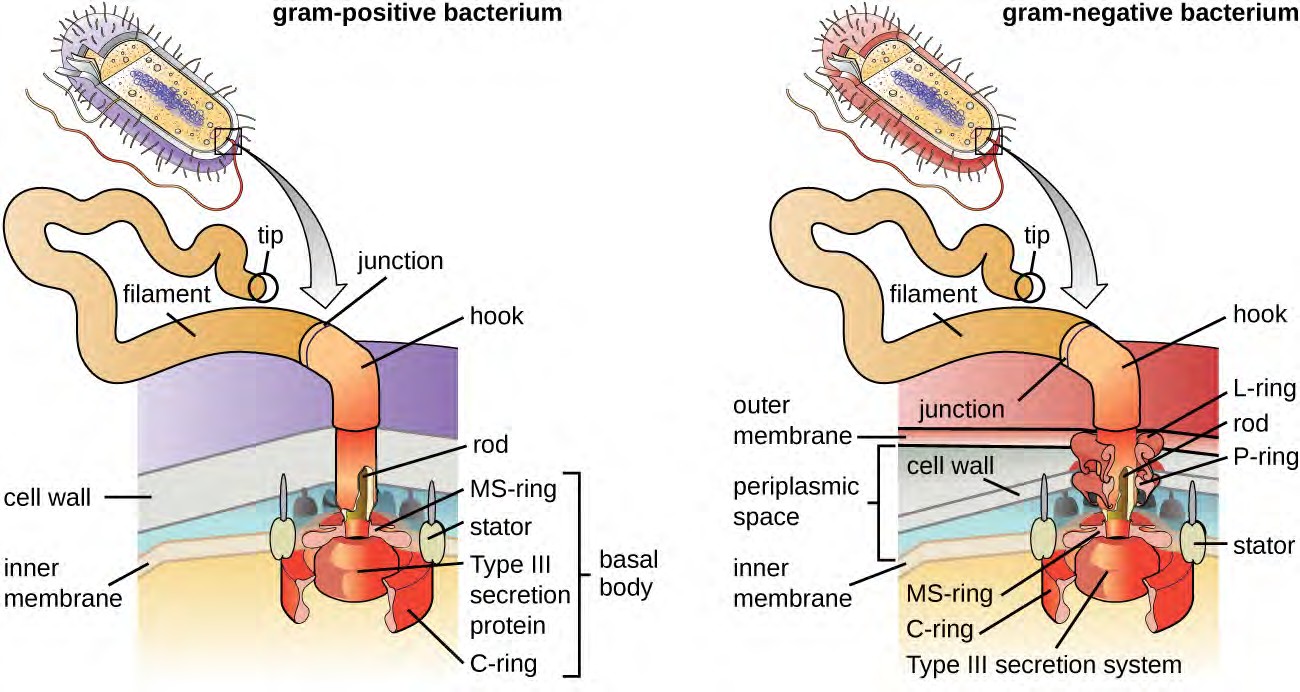 Name at least two ways that prokaryotic flagella are different from eukaryotic flagella.