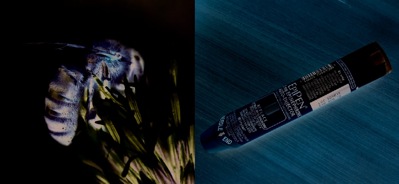 Figure 19.1 Bee stings and other allergens can cause life-threatening, systemic allergic reactions. Sensitive individuals may need to carry an epinephrine auto-injector (e.g., EpiPen) in case of a sting. A bee-sting allergy is an example of an immune response that is harmful to the host rather than protective; epinephrine counteracts the severe drop in blood pressure that can result from the immune response. (credit right: modification of work by Carol Bleistine)