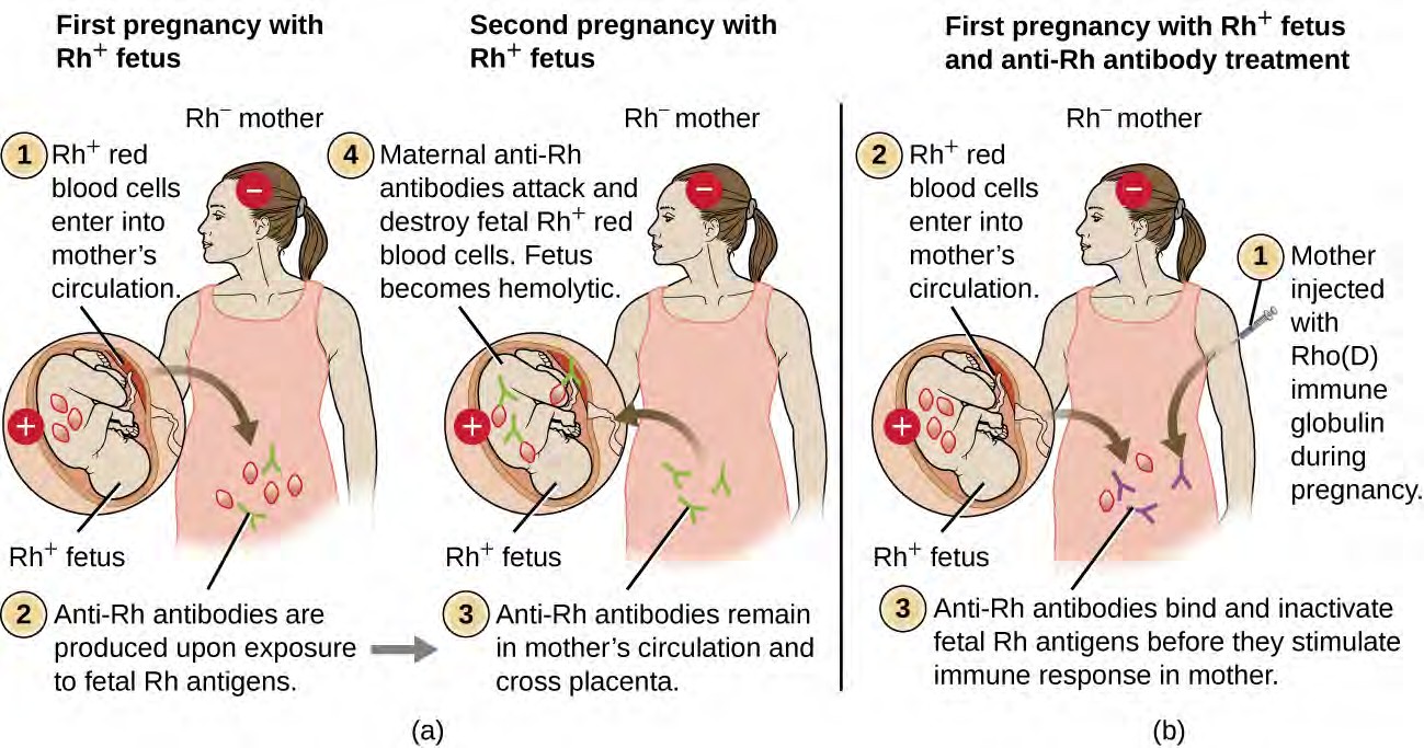 Figure 19.6 (a) When an Rh− mother has an Rh+ fetus, fetal erythrocytes are introduced into the mother’s circulatory system before or during birth, leading to production of anti-Rh IgG antibodies. These antibodies remain in the mother and, if she becomes pregnant with a second Rh+ baby, they can cross the placenta and attach to fetal Rh+ erythrocytes. Complement-mediated hemolysis of fetal erythrocytes results in a lack of sufficient cells for proper oxygenation of the fetus. (b) HDN can be prevented by administering Rho(D) immune globulin during and after each pregnancy with an Rh+ fetus. The immune globulin binds fetal Rh+ RBCs that gain access to the mother’s bloodstream, preventing activation of her primary immune response.