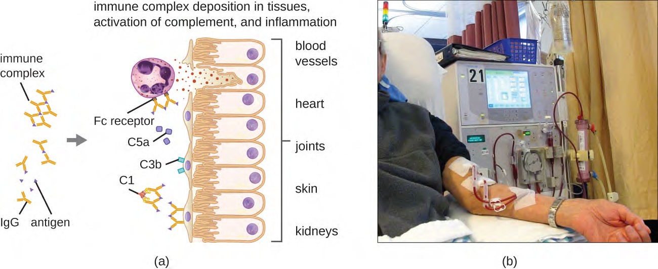 Figure 19.7 Type III hypersensitivities and the systems they affect. (a) Immune complexes form and deposit in tissue. Complement activation, stimulation of an inflammatory response, and recruitment and activation of neutrophils result in damage to blood vessels, heart tissue, joints, skin, and/or kidneys. (b) If the kidneys are damaged by a type III hypersensitivity reaction, dialysis may be required.
