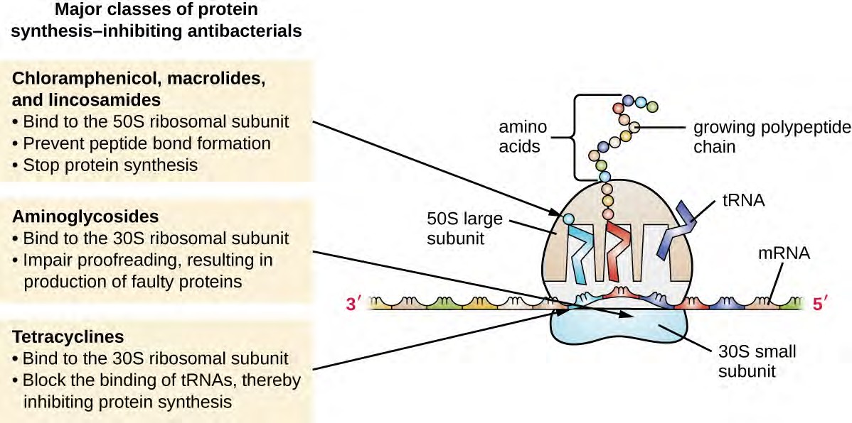 50S ribosomal subunit | Macrolides, lincosamides, chloramphenicol, oxazolidinones | |