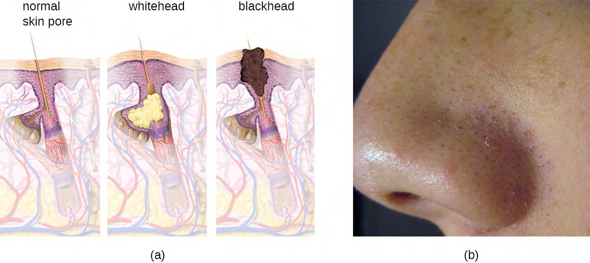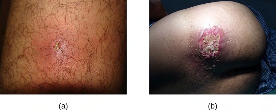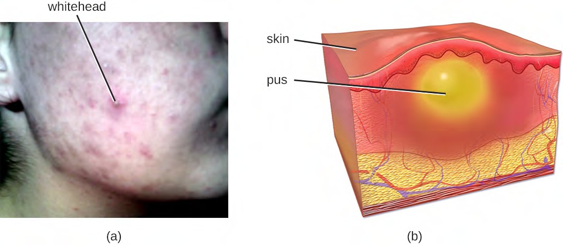 Figure 21.4 (a) Acne is a bacterial infection of the skin that manifests as a rash of inflamed hair follicles (folliculitis). The large whitehead near the center of the cheek is an infected hair follicle that has become purulent (or suppurative), leading to the formation of a furuncle. (b) An abscess is a pus-filled lesion. (credit b: modification of work by Bruce Blaus)