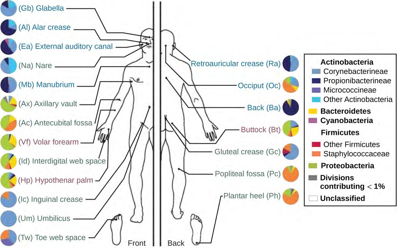 Figure 21.3 The normal microbiota varies on different regions of the skin, especially in dry versus moist areas. The figure shows the major organisms commonly found in different locations of a healthy individual’s skin and external mucosa. Note that there is significant variation among individuals. (credit: modification of work by National Human Genome Research Institute)