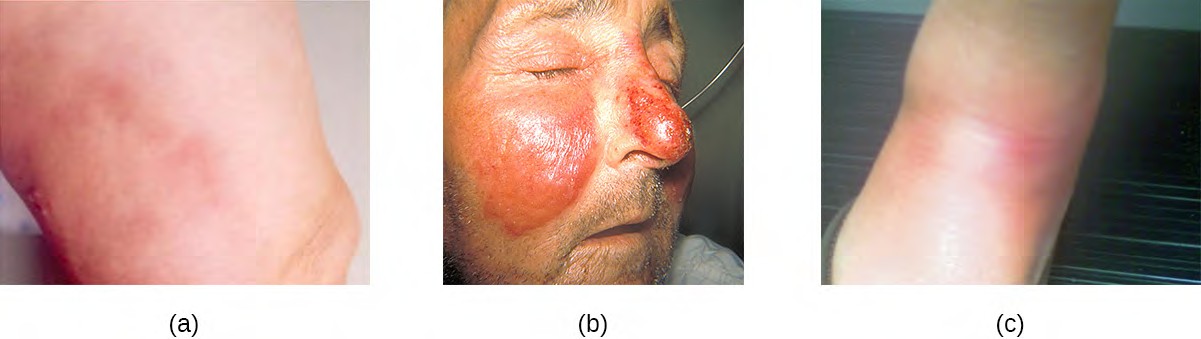 In some cases, infectious microbes can cause a variety of rashes or lesions that differ in their physical characteristics. These rashes can be the result of inflammation reactions or direct responses to toxins produced by the microbes. Table 21.1 lists some of the medical terminology used to describe skin lesions and rashes based on their characteristics; Figure 21.4 and Figure 21.5 illustrate some of the various types of skin lesions. It is important to note that many different diseases can lead to skin conditions of very similar appearance; thus the terms used in the table are generally not exclusive to a particular type of infection or disease.