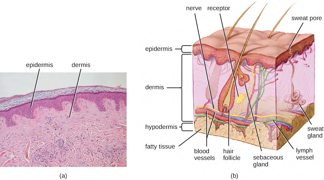 Figure 21.2 (a) A micrograph of a section through human skin shows the epidermis and dermis. (b) The major layers of human skin are the epidermis, dermis, and hypodermis. (credit b: modification of work by National Cancer Institute)