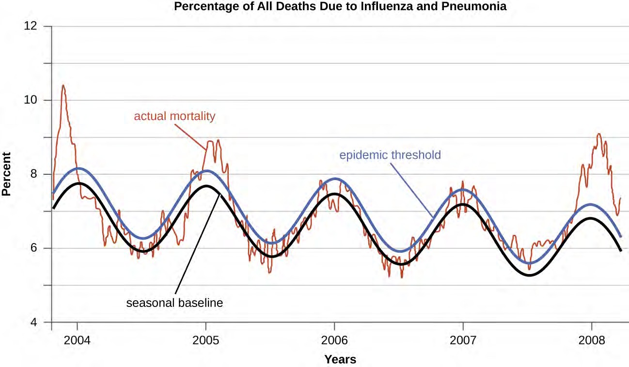 Figure 16.4 The seasonal epidemic threshold (blue curve) is set by the CDC-based data from the previous five years. When actual mortality rates exceed this threshold, a disease is considered to be epidemic. As this graph shows, pneumonia- and influenza-related mortality saw pronounced epidemics during the winters of 2003–2004, 2005, and 2008. (credit: modification of work by Centers for Disease Control and Prevention)