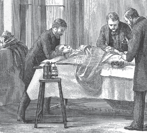 Figure 16.8 Joseph Lister initiated the use of a carbolic acid (phenol) during surgeries. This illustration of a surgery shows a pressurized canister of carbolic acid being sprayed over the surgical site.