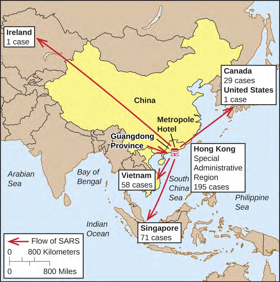 In the meantime, SARS spread to other countries on its way to becoming a global pandemic. Though the infectious agent had yet to be identified, it was thought to be an influenza virus. The disease was named SARS, an acronym for severe acute respiratory syndrome, until the etiologic agent could be identified. Travel restrictions to Southeast Asia were enforced by many countries. By the end of the outbreak, there were 8,098 cases and 774 deaths worldwide. China and Hong Kong were hit hardest by the epidemic, but Taiwan, Singapore, and Toronto, Canada, also saw significant numbers of cases (Figure 16.17).
