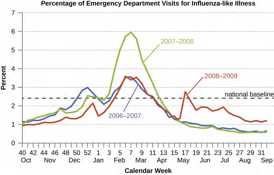 Figure 16.3 The 2007–2008 influenza season in the United States saw much higher than normal numbers of visits to emergency departments for influenza-like symptoms as compared to the previous and the following years. (credit: modification of work by Centers for Disease Control and Prevention)