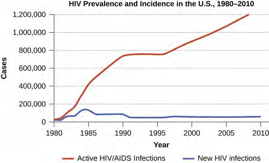 million people 13 years and older with an active human immunodeficiency virus (HIV) infection. Expressed as a proportion, or rate, this is a prevalence of 467 infected persons per 100,000 in the population.[1] On the other hand, incidence is the number or proportion of new cases in a period of time. For the same year and population, the CDC estimates that there were 43,165 newly diagnosed cases of HIV infection, which is an incidence of 13.7 new cases