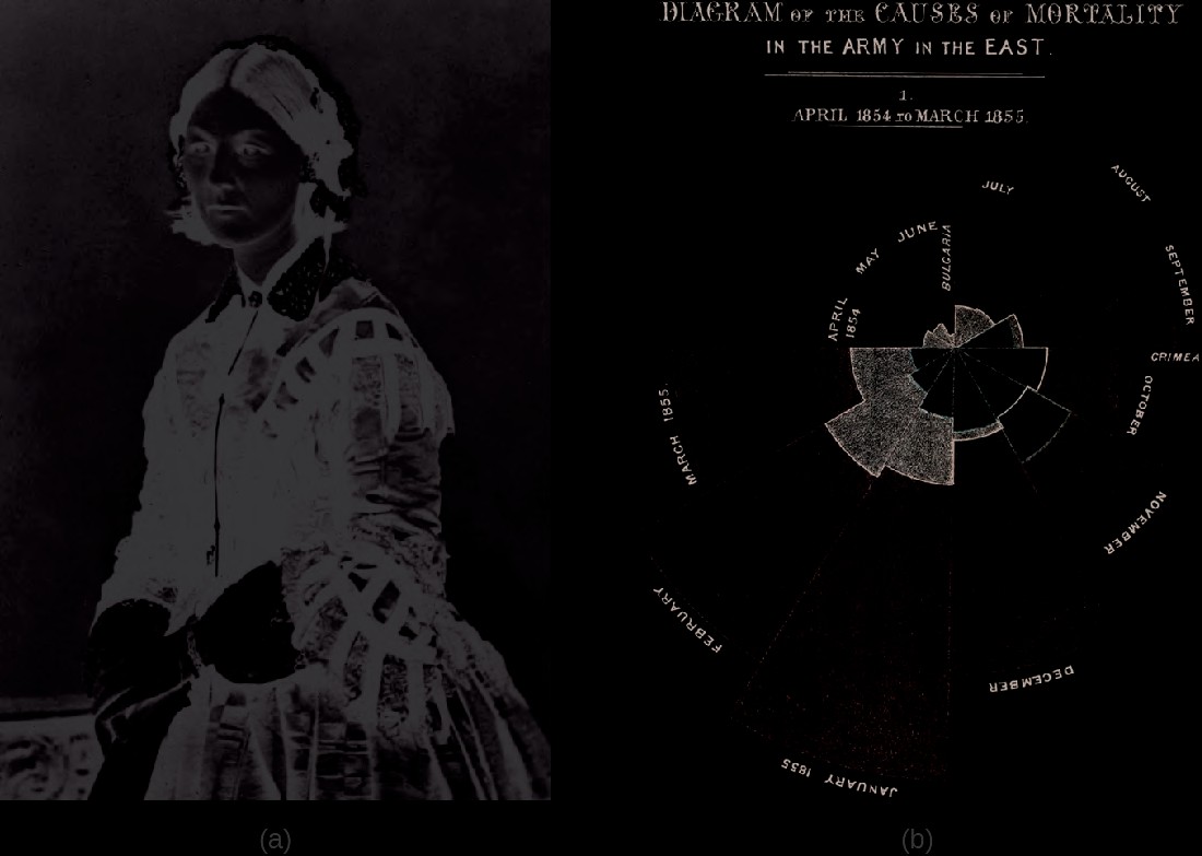 Figure 16.7 (a) Florence Nightingale reported on the data she collected as a nurse in the Crimean War. (b) Nightingale’s diagram shows the number of fatalities in soldiers by month of the conflict from various causes. The total number dead in a particular month is equal to the area of the wedge for that month. The colored sections of the wedge represent different causes of death: wounds (pink), preventable infectious diseases (gray), and all other causes (brown).