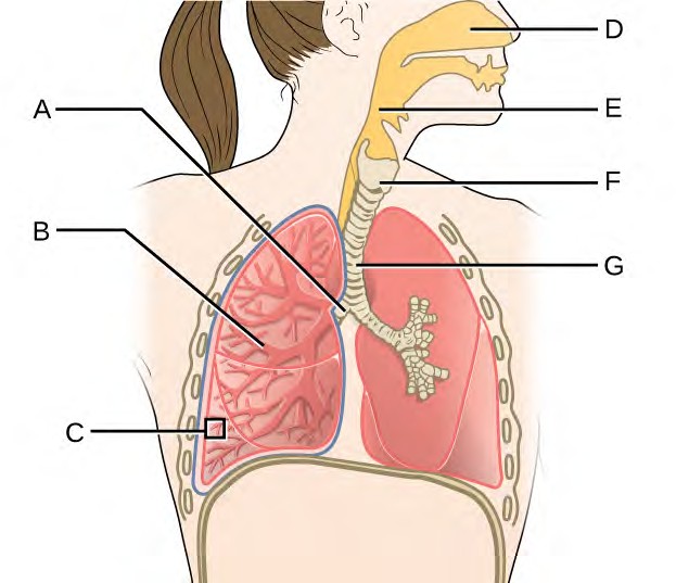 The lower respiratory system begins below the epiglottis in the larynx or voice box (Figure 22.3). The trachea, or windpipe, is a cartilaginous tube extending from the larynx that provides an unobstructed path for air to reach the lungs. The trachea bifurcates into the left and right bronchi as it reaches the lungs. These paths branch repeatedly to form smaller and more extensive networks of tubes, the bronchioles. The terminal bronchioles formed in this tree- like network end in cul-de-sacs called the alveoli. These structures are surrounded by capillary networks and are the site of gas exchange in the respiratory system. Human lungs contain on the order of 400,000,000 alveoli. The outer surface of the lungs is protected with a double-layered pleural membrane. This structure protects the lungs and provides lubrication to permit the lungs to move easily during respiration.