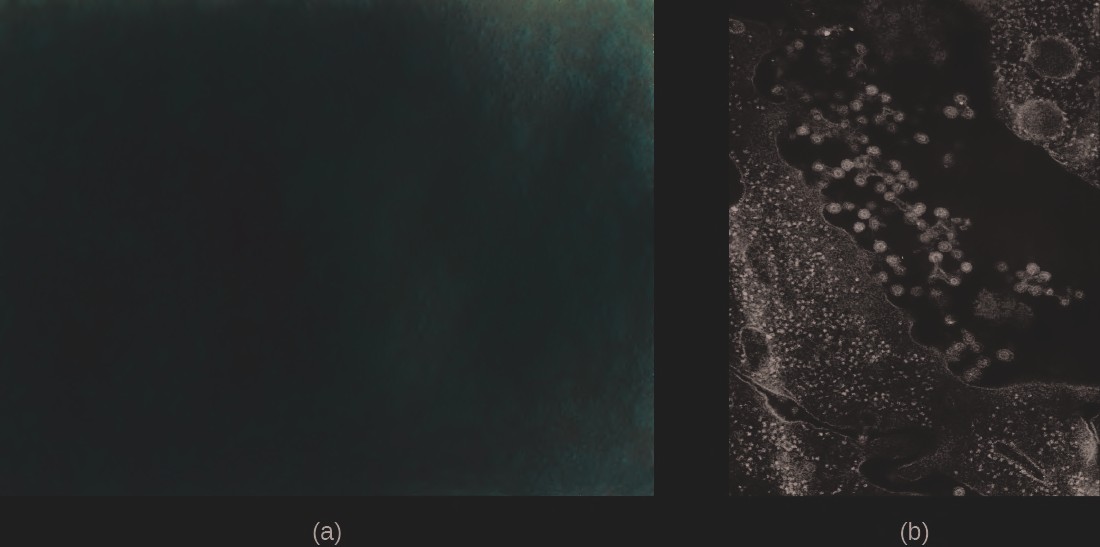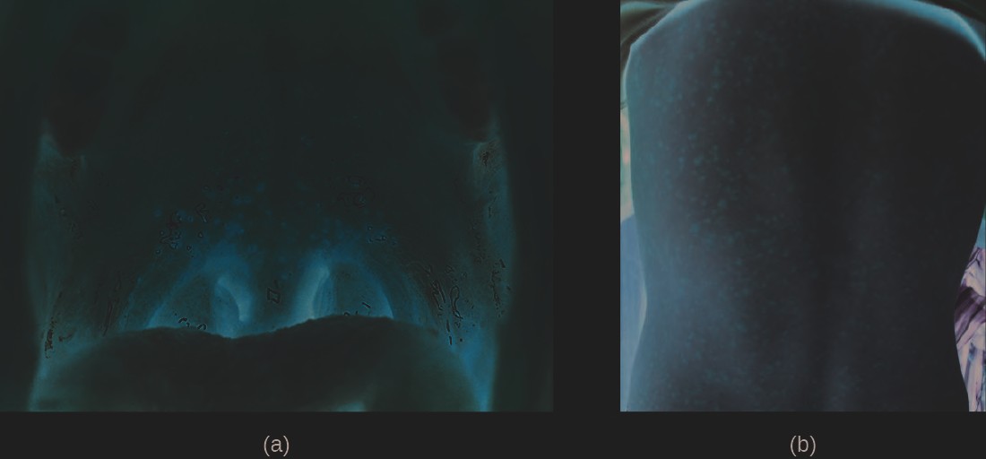 Figure 22.7 (a) A healthy tympanic membrane; the middle ear bones can be seen behind the membrane. (b) An ear with chronic inflammation that has resulted in a torn membrane, erosion of the inner ear bones, and mucus buildup. (credit a: modification of work by “DrER.tv”/YouTube; credit b: modification of work by Li Mg, Hotez PJ, Vrabec JT, Donovan DT)