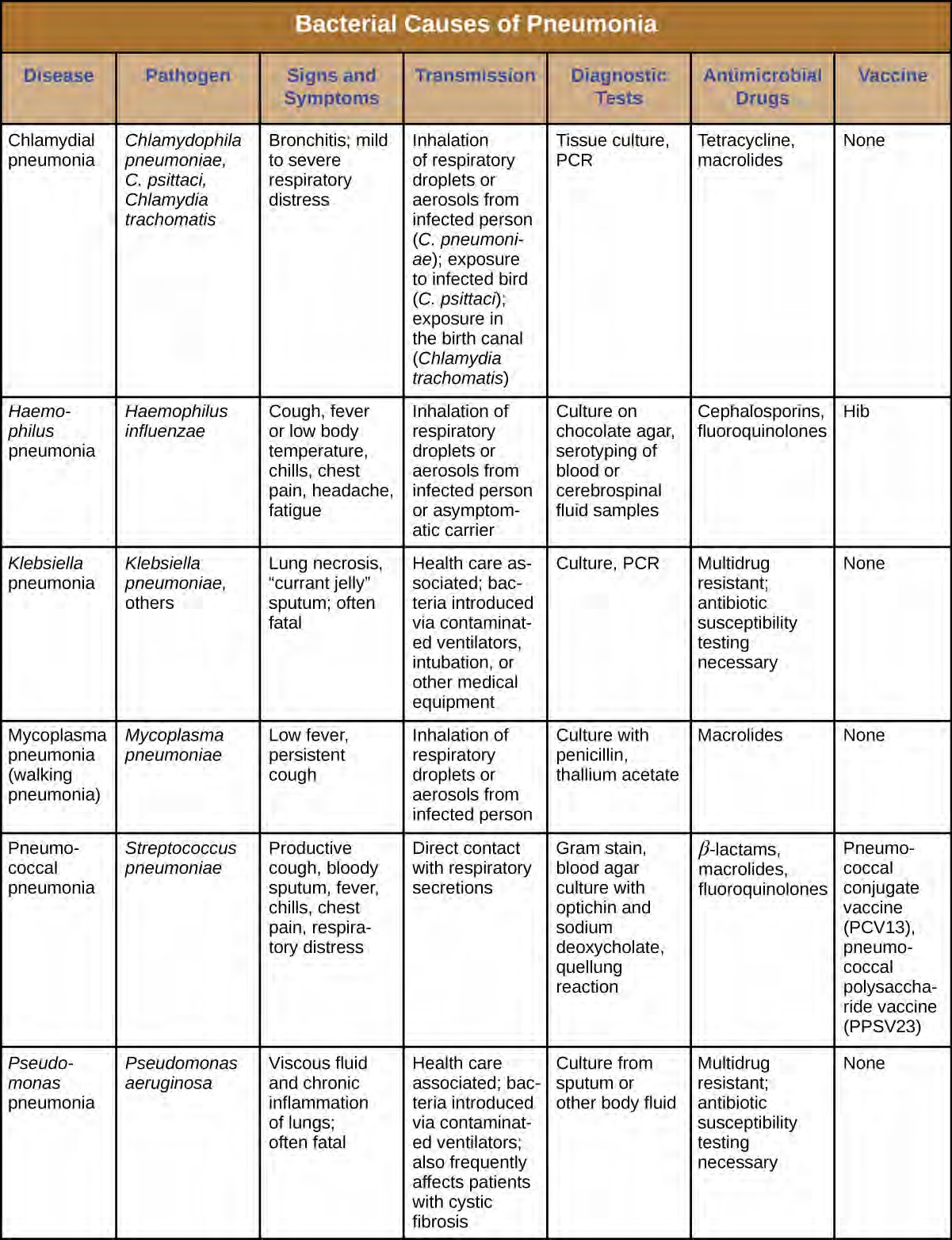 | Pneumonia | Streptococcus pneumoniae | Pneumococcal conjugate vaccine (PCV13), pneumococcal polysaccharide vaccine (PPSV23) |