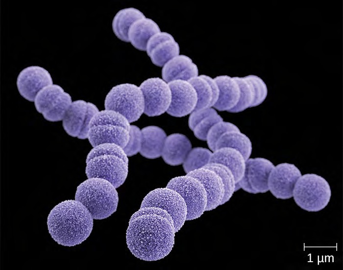 Figure 22.5 This scanning electron micrograph of Streptococcus pyogenes shows the characteristic cellular phenotype resembling chains of cocci. (credit: modification of work by U.S. Centers for Disease Control and Prevention - Medical Illustrator)