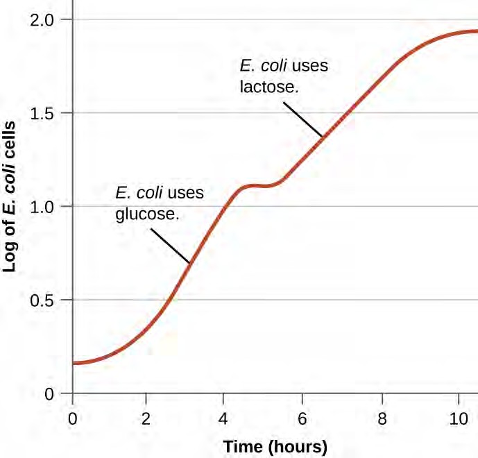 The following figure is from Monod’s original work on diauxic growth showing the growth of E. coli in the simultaneous presence of xylose and glucose as the only carbon sources. Explain what is happening at points A–D with respect to the carbon source being used for growth, and explain whether the xylose-use operon is being expressed (and why). Note that expression of the enzymes required for xylose use is regulated in a manner similar to the expression of the enzymes required for lactose use.
