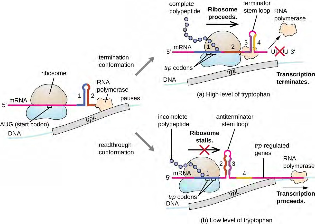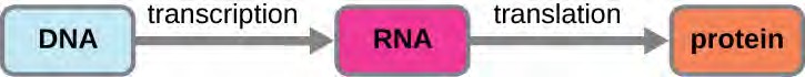 A gene is composed of DNA that is “read” or transcribed to produce an RNA molecule during the process of transcription. One major type of RNA molecule, called messenger RNA (mRNA), provides the information for the ribosome to catalyze protein synthesis in a process called translation. The processes of transcription and translation are collectively referred to as gene expression. Gene expression is the synthesis of a specific protein with a sequence of amino acids that is encoded in the gene. The flow of genetic information from DNA to RNA to protein is described by the central dogma (Figure 11.2). This central dogma of molecular biology further elucidates the mechanism behind Beadle and Tatum’s “one gene-one enzyme” hypothesis (see Using Microorganisms to Discover the Secrets of Life). Each of the processes of replication, transcription, and translation includes the stages of 1) initiation, 2) elongation (polymerization), and 3) termination. These stages will be described in more detail in this chapter.