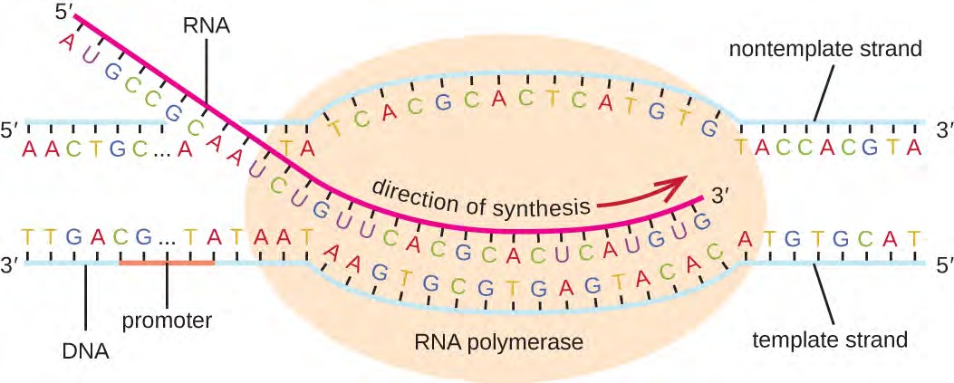 During the process of transcription, the information encoded within the DNA sequence of one or more genes is transcribed into a strand of RNA, also called an RNA transcript. The resulting single-stranded RNA molecule, composed of ribonucleotides containing the bases adenine (A), cytosine (C), guanine (G), and uracil (U), acts as a mobile molecular copy of the original DNA sequence. Transcription in prokaryotes and in eukaryotes requires the DNA double helix to partially unwind in the region of RNA synthesis. The unwound region is called a transcription bubble. Transcription of a particular gene always proceeds from one of the two DNA strands that acts as a template, the so-called antisense strand. The RNA product is complementary to the template strand of DNA and is almost identical to the nontemplate DNA strand, or the sense strand. The only difference is that in RNA, all of the T nucleotides are replaced with U nucleotides; during RNA synthesis, U is incorporated when there is an A in the complementary antisense strand.