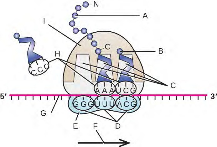 Label the following in the figure: ribosomal E, P, and A sites; mRNA; codons; anticodons; growing polypeptide; incoming amino acid; direction of translocation; small ribosomal unit; large ribosomal unit.