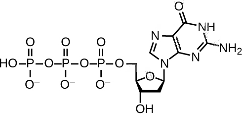 Figure 11.6 This structure shows the guanosine triphosphate deoxyribonucleotide that is incorporated into a growing DNA strand by cleaving the two end phosphate groups from the molecule and transferring the energy to the sugar phosphate bond. The other three nucleotides form analogous structures.