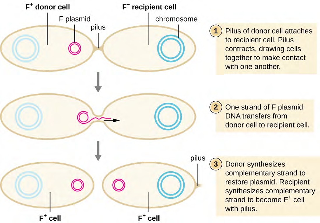 Briefly describe two ways in which chromosomal DNA from a donor cell may be transferred to a recipient cell during the process of conjugation.