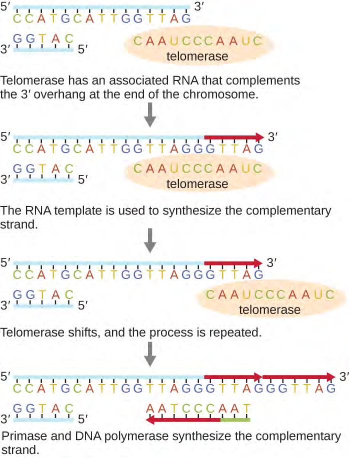 The ends of the linear chromosomes are known as telomeres and consist of noncoding repetitive sequences. The telomeres protect coding sequences from being lost as cells continue to divide. In humans, a six base-pair sequence, TTAGGG, is repeated 100 to 1000 times to form the telomere. The discovery of the enzyme telomerase (Figure 11.9) clarified our understanding of how chromosome ends are maintained. Telomerase contains a catalytic part and a built-in RNA template. It attaches to the end of the chromosome, and complementary bases to the RNA template are added on the 3’ end of the DNA strand. Once the 3’ end of the lagging strand template is sufficiently elongated, DNA polymerase can add the nucleotides complementary to the ends of the chromosomes. In this way, the ends of the chromosomes are replicated. In humans, telomerase is typically active in germ cells and adult stem cells; it is not active in adult somatic cells and may be associated with the aging of these cells. Eukaryotic microbes including fungi and protozoans also produce telomerase to maintain chromosomal integrity. For her discovery of telomerase and its action, Elizabeth Blackburn (1948–) received the Nobel Prize for Medicine or Physiology in 2009.
