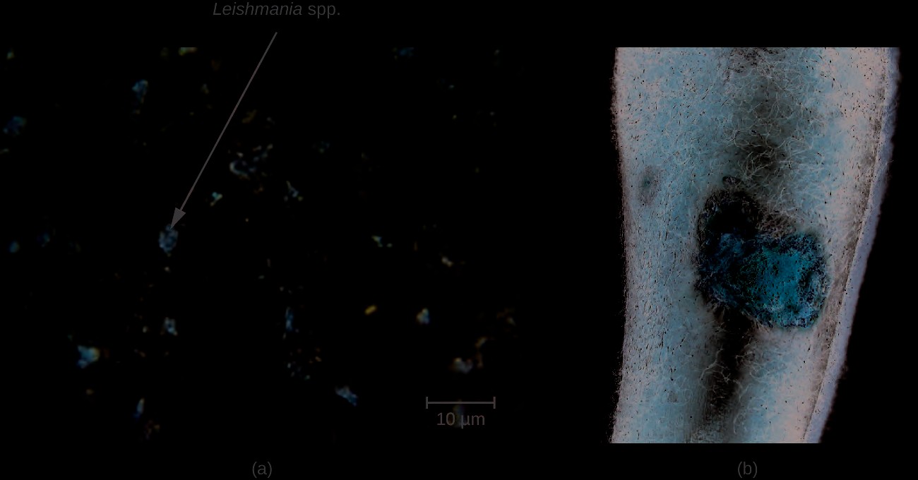 Leishmaniasis is caused by the protozoan Leishmania and is transmitted by sand flies. Symptoms are generally mild, but serious cases may cause organ damage, anemia, and loss of immune competence.