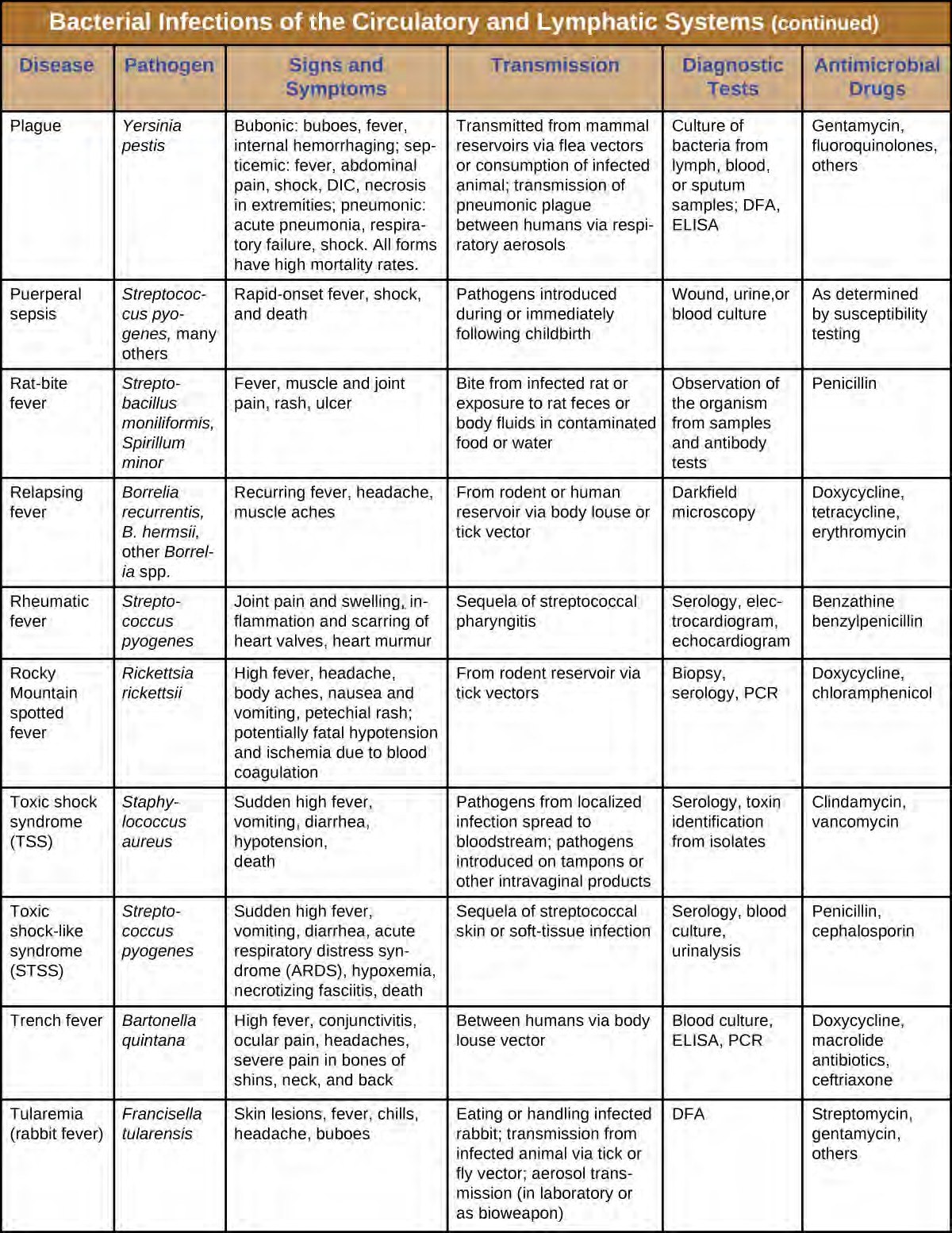 Compare the major characteristics of specific bacterial diseases affecting the circulatory and lymphatic systems