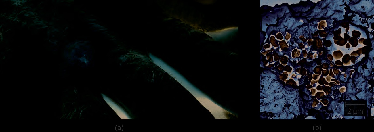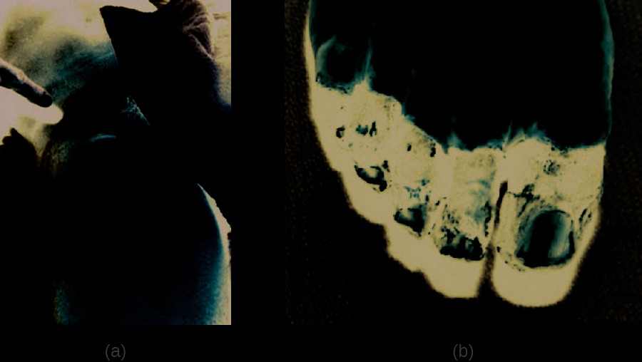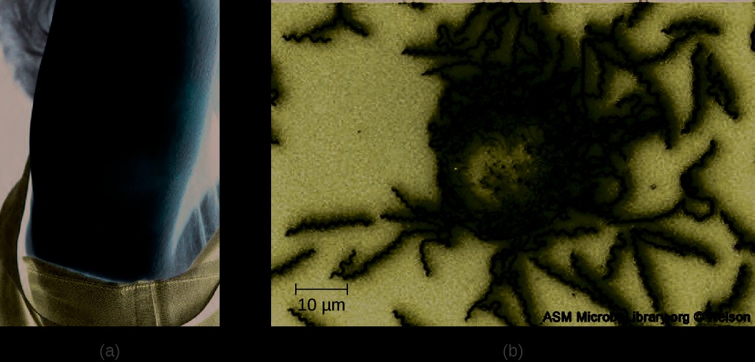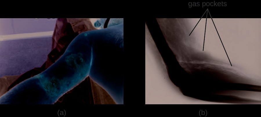 Figure 25.7 (a) In this image of a patient with gas gangrene, note the bluish-purple discoloration around the bicep and the irregular margin of the discolored tissue indicating the spread of infection. (b) A radiograph of the arm shows a darkening in the tissue, which indicates the presence of gas. (credit a, b: modification of work by Aggelidakis J, Lasithiotakis K, Topalidou A, Koutroumpas J, Kouvidis G, and Katonis P)