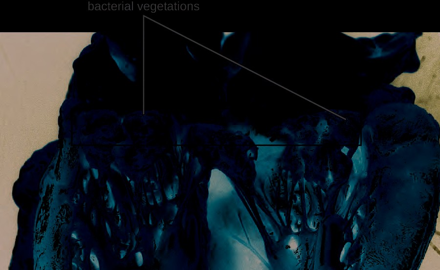 In subacute bacterial endocarditis, heart valve damage occurs slowly over a period of months. During this time, blood clots form in the heart, and these protect the bacteria from phagocytes. These patches of tissue-associated bacteria are called vegetations. The resulting damage to the heart, in part resulting from the immune response causing fibrosis of heart valves, can necessitate heart valve replacement (Figure 25.6). Outward signs of subacute endocarditis may include a fever.