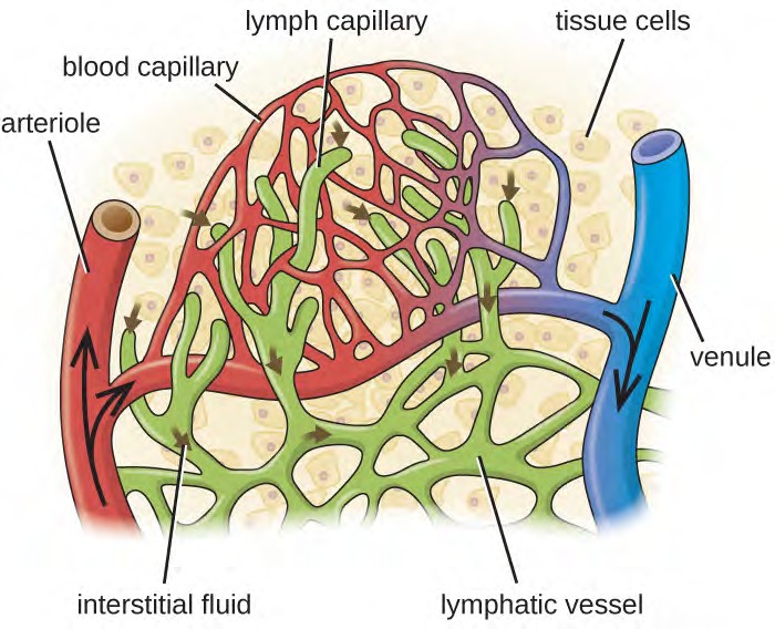 Figure 25.4 Blood enters the capillaries from an arteriole (red) and leaves through venules (blue). Interstitial fluids may drain into the lymph capillaries (green) and proceed to lymph nodes. (credit: modification of work by National Cancer Institute, National Institutes of Health)