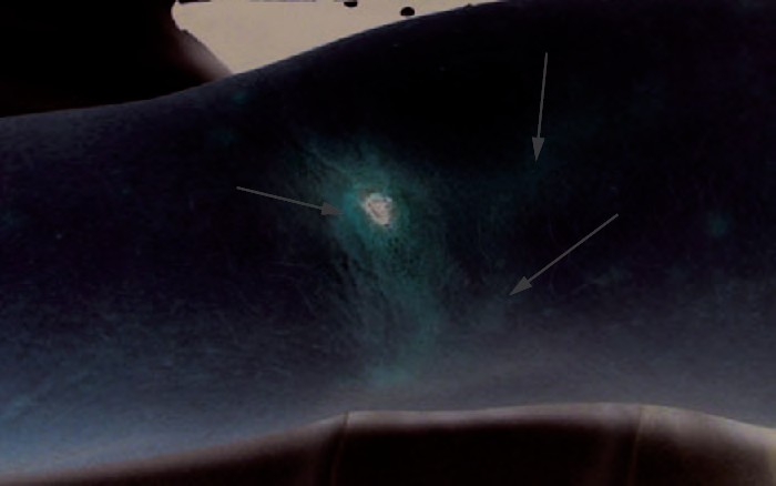 What term refers to the red streaks seen on this patient’s skin? What is likely causing this condition?