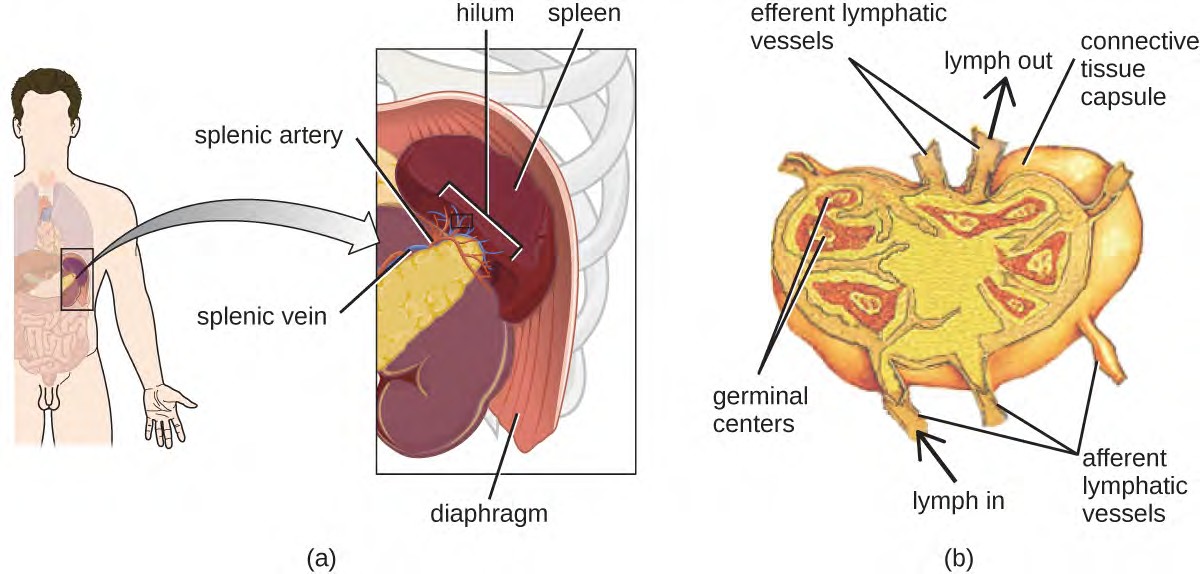 Figure 25.5 (a) The spleen is a lymphatic organ located in the upper left quadrant of the abdomen near the stomach and left kidney. It contains numerous phagocytes and lymphocytes that combat and prevent circulatory infections by killing and removing pathogens from the blood. (b) Lymph nodes are masses of lymphatic tissue located along the larger lymph vessels. They contain numerous lymphocytes that kill and remove pathogens from lymphatic fluid that drains from surrounding tissues.