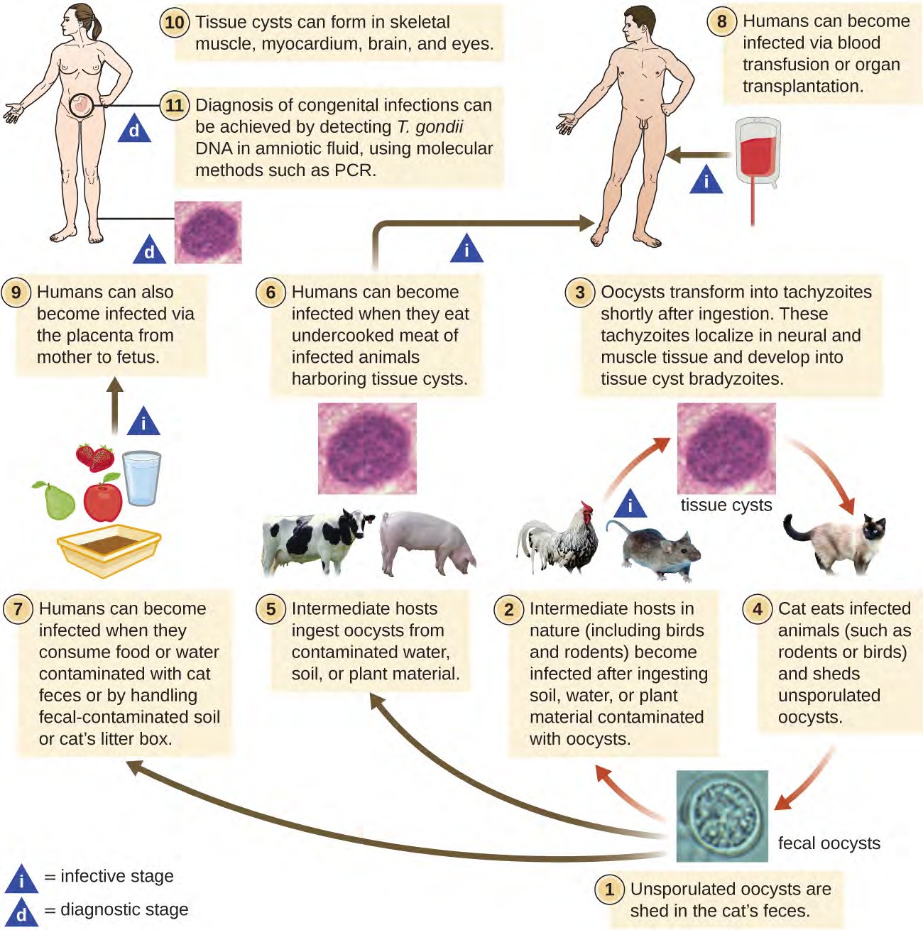 Toxoplasmosis is a widespread protozoal infection that can cause serious infections in the immunocompromised and in developing fetuses. Domestic cats are the definitive host.